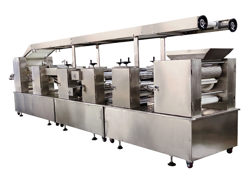 3、設(shè)備為變頻控制,每一道壓輥都采用單機(jī)驅(qū)動(dòng),通過(guò)測(cè)距傳感器,實(shí)現(xiàn)自動(dòng)面帶張緊控制,多輥聯(lián)動(dòng)。快速輕松地制作大量面皮,提高生產(chǎn)效率。